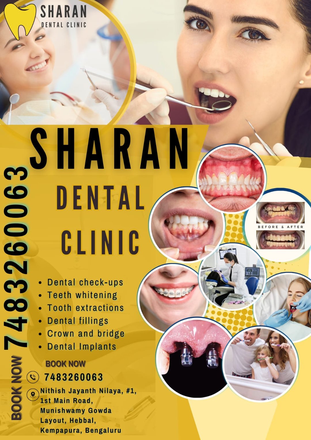 Sharan Dental Clinic is dedicated to provide top-notch dental care to residents in and around Kempapura, Hebbal. We offer complete dental care which includes dental checkup, tooth cleaning, tooth whitening, root canal treatment, cavity filling, dentures, dental implants, braces & aligners, dental veneers, gum surgeries, orthodontics & pediatric dental care (dentist for kids). Our doctors ensure that you get the best dental care by following industry standard safety protocols. With highly skilled dentists & state-of-the-art technology to provide advanced dental care, we offer a warm & welcoming environment to ensure your safety & comfort.